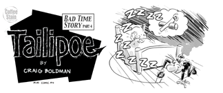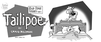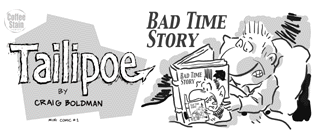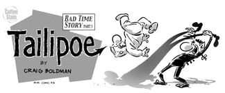 Jumping on the mini-comic bandwagon -- This is the first mini-comic from my new, spontaneous imprint, Coffee Stain Comics. "Bad Time Story" collects the first 12 weeks of Tailipoe strips (meaning, 12 strips!) from my website. You have been reading Tailipoe, haven't you? Printed on my own personal laser printer, which is showing its age. Thus, my company motto, "Look For The Printing Streak of Quality." Order here and I'll sign the thing and do a Tailipoe sketch on the back page. 12 pages plus covers. Black and white, 3.75" tall by 8.5" wide.