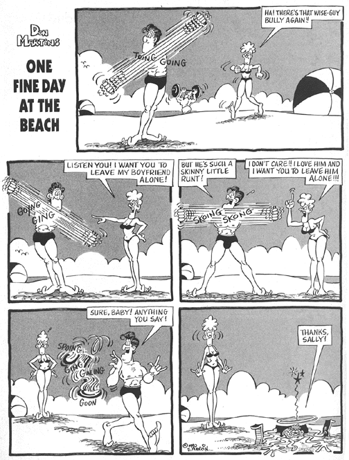 At first glance the addition of the extra panel seemed like a needless change for the sake of change, but on closer examination, it actually transforms the gag. In my version, the reader could assume that the girl was fully aware that the bully was trashing her boyfriend even as she was chastising him. In Don's version, the girl walks onstage while the bully's already going at it, so when the boyfriend is revealed, she is surprised at the same moment the reader is.