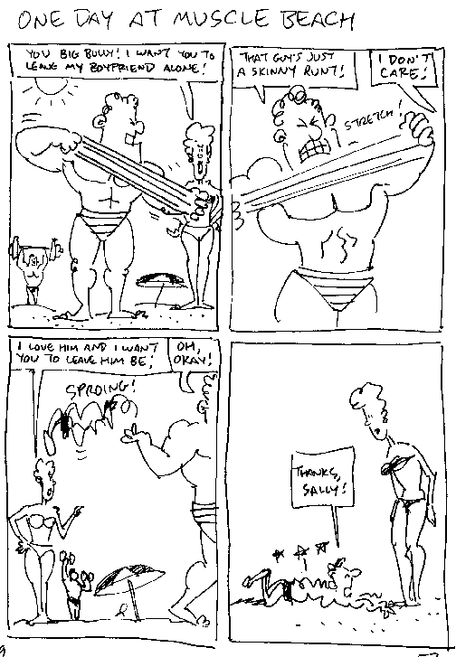 You mentioned you hadn't seen any of your gags that I've finished up. Here's one that I just did and will appear in Cracked #259. The muscle man stretching the guy on the beach will be next -- Probably within the next couple issues.