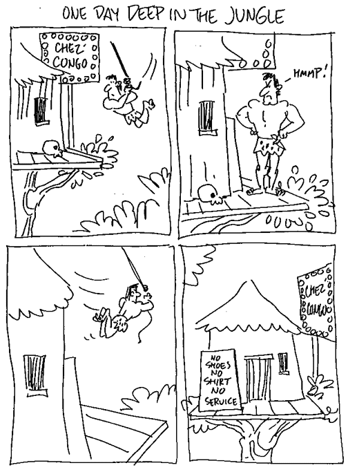 In some writing situations, I expect the artist to follow the script reasonably closely. For an assignment like this, however, I was writing in service of Don's unique brand of cartooning, and I fully expected him to change things around as he saw fit. In fact, that was part of the fun of it for me: to see how my gag would turn out after being processed through the Don Martin filter. Here's one of my favorites: